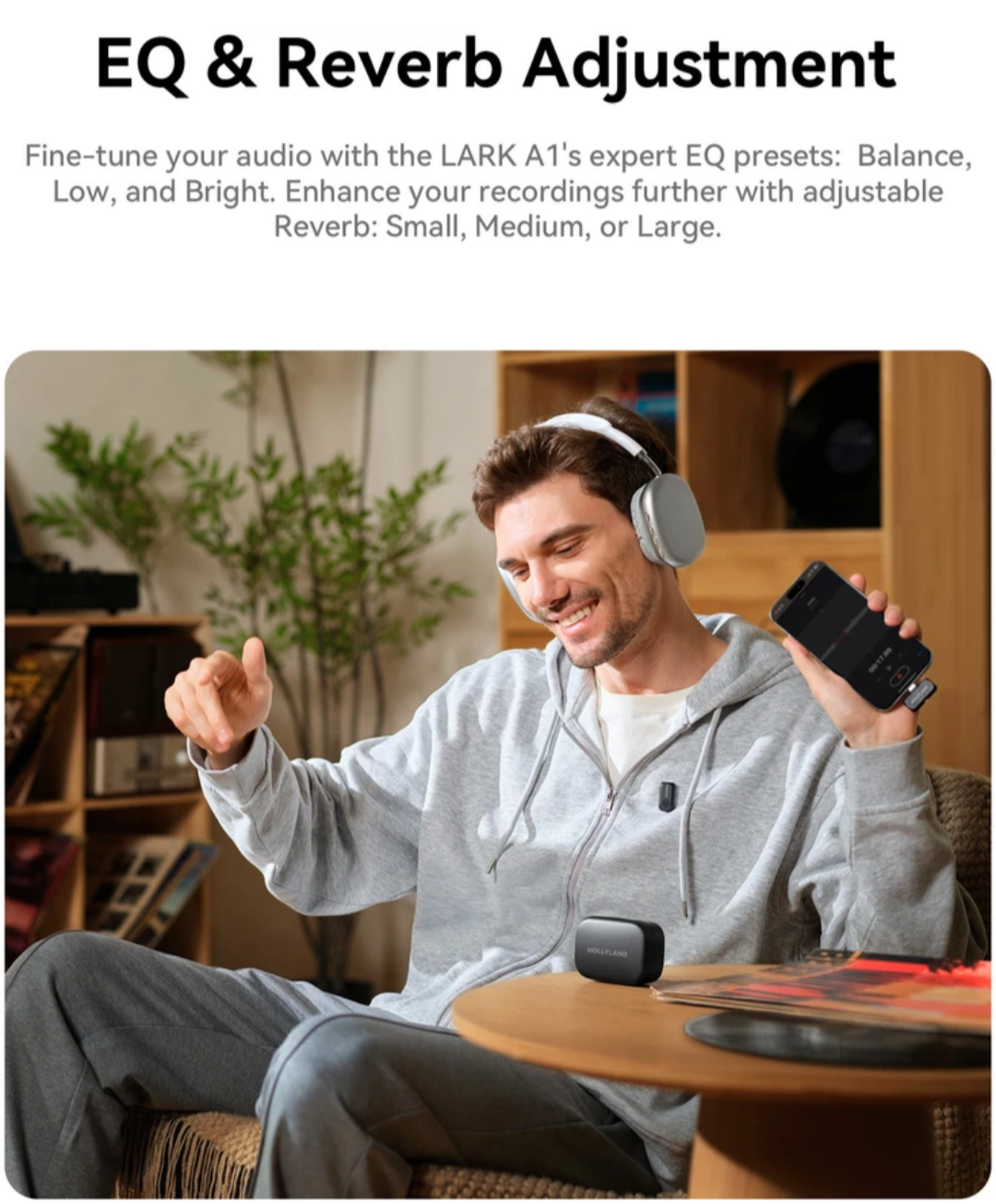 【EQ & Reverb Customizable Sound】LARK A1 wireless microphone mic features 3 EQ (Balance/Low/Bright) & 3 Reverb modes (Small/Medium/Large) for instant audio customization. Achieve clear, deep studio-quality sound with minimal editing—perfect for podcasters, ASMR creators, and filmmakers shooting video.